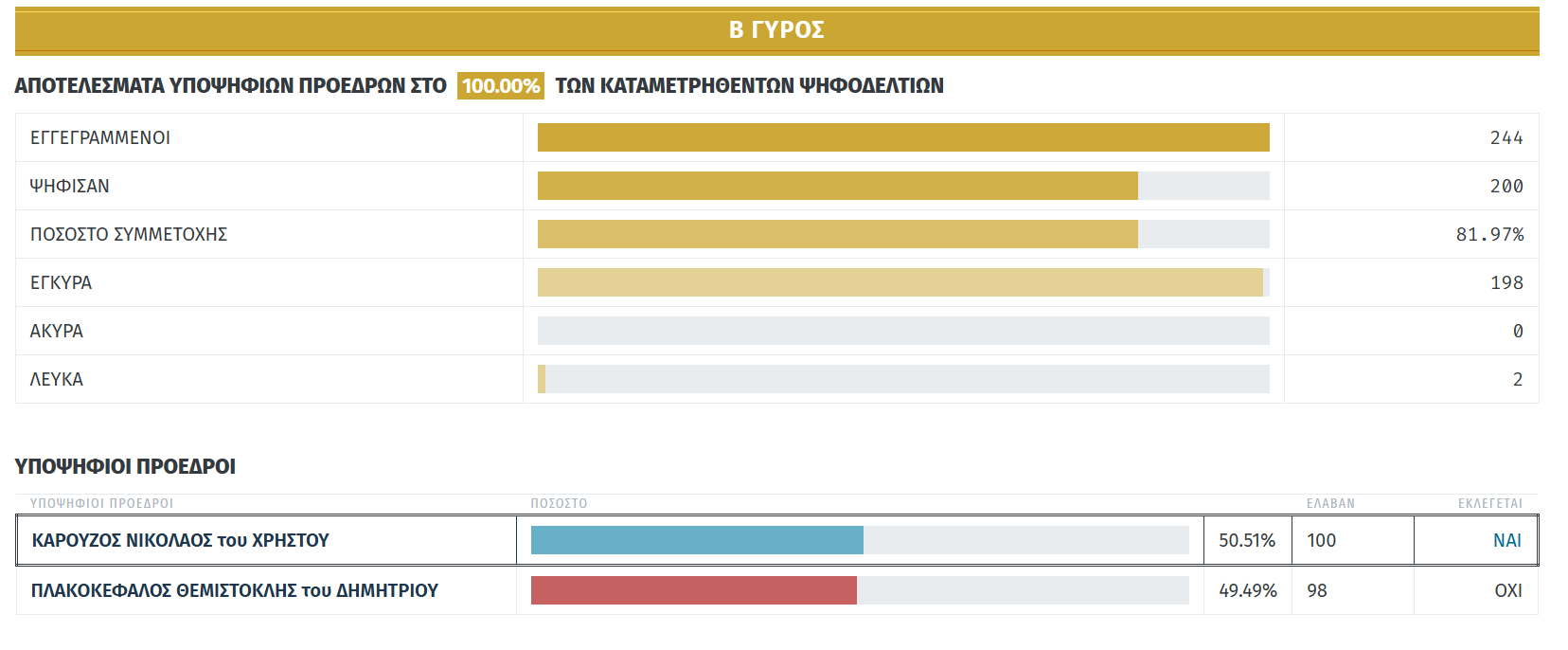 Πιο αναλυτικά, ο Νικόλαος Καρούζος επικράτησε με ποσοστό 50,51%, συγκεντρώνοντας 100 ψήφους. Ο έτερος υποψήφιος, Θεμιστοκλής Πλακοκέφαλος του Δημητρίου, έλαβε 98 ψήφους και ποσοστό 49,49%. Μάλιστα, η επικράτηση ήταν με μεγάλη εκλογική ανατροπή, αφού ο κ. Πλακοκέφαλος είχε οδηγηθεί στον β’ γύρο με λίγο περισσότερο από 40%, ενώ ο εκλεγμένος πλέον πρόεδρος στον α’ γύρο πήρε 25,5%