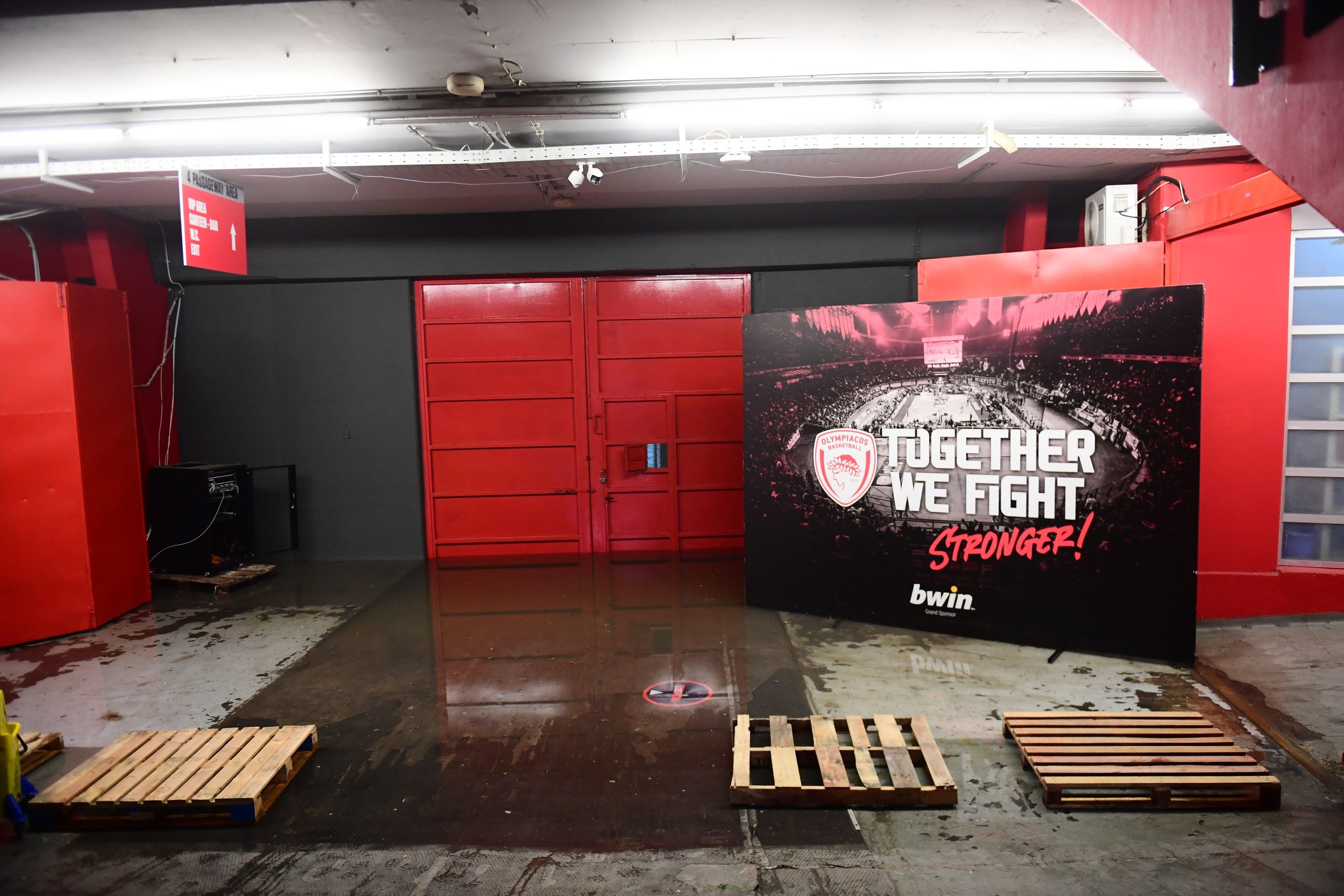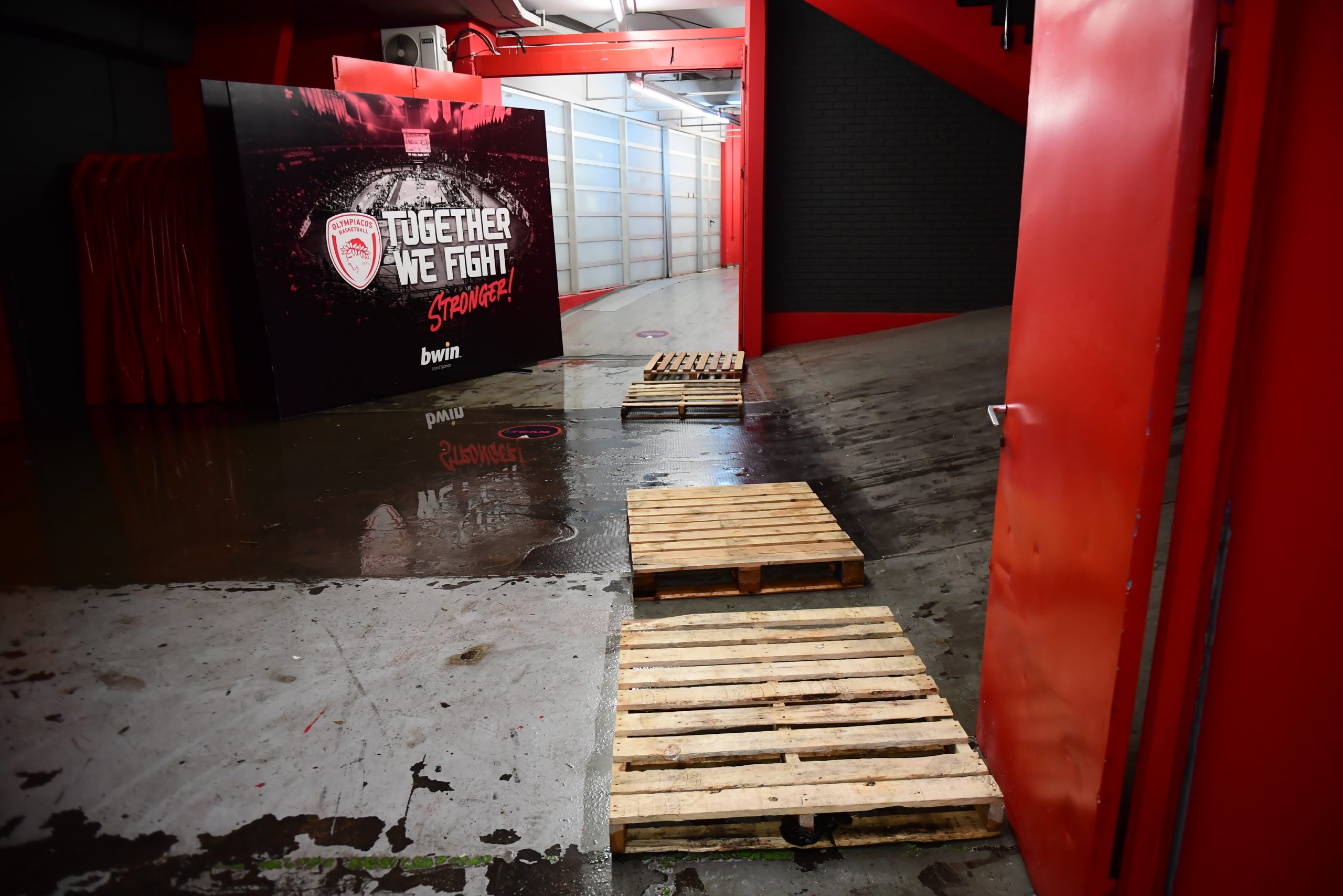 Εκείνο το σημείο που βρίσκεται κάτω από τη θύρα των οργανωμένων και χρησιμοποιεί ο Ολυμπιακός για τους θεατές που κάθονται στα baseline courts πλημμύρισε, όπως είχε συμβεί και ακριβώς πριν έξι μέρες στο Πανελλήνιο Ταε Κβο Ντο.