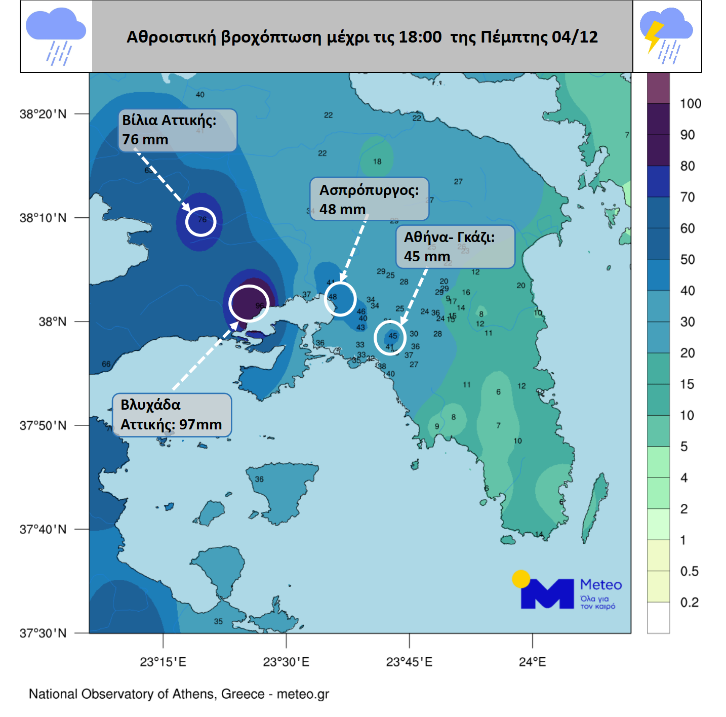 (ΓΙΑΝΝΗΣ ΠΑΝΑΓΟΠΟΥΛΟΣ/EUROKINISSI) Σε συμφωνία με τα προγνωστικά στοιχεία των προηγούμενων ημερών, σημαντικές βροχοπτώσεις εκδηλώνονται στο νομό Αττικής αλλά και στην πόλη της Αθήνας από το μεσημέρι της Πέμπτης 04/12. Στο χάρτη που ακολουθεί αποτυπώνονται τα αθροιστικά ύψη βροχόπτωσης έως τις 18:00 το απόγευμα, όπως αυτά καταγράφηκαν από 101 μετεωρολογικούς σταθμούς του δικτύου αυτόματων μετεωρολογικών σταθμών του Εθνικού Αστεροσκοπείου Αθηνών / meteo.gr.